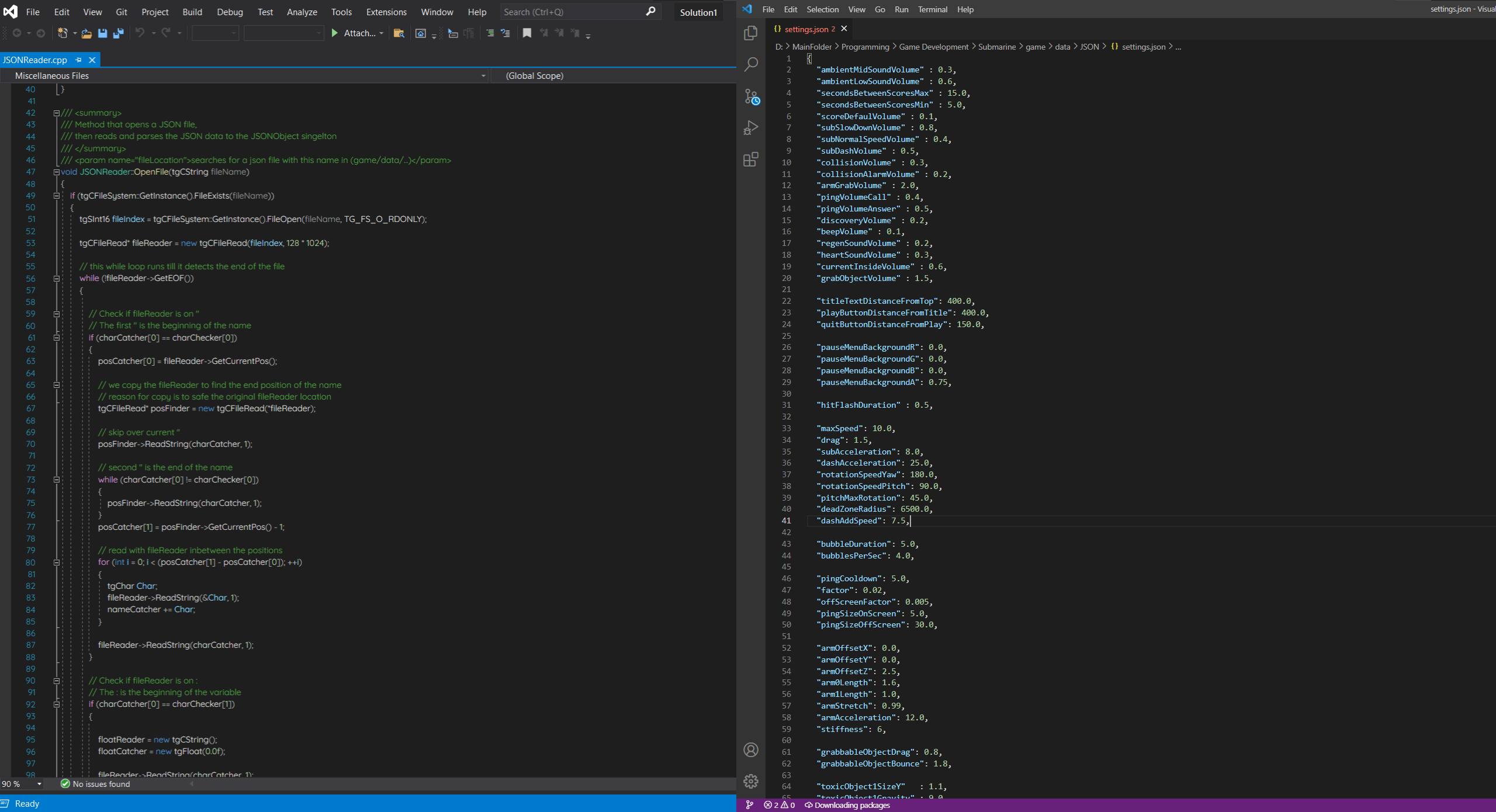 During the first PSQ project(Subaquatic Secrets). The Designers wanted to adjust and change values of the game but didnt want to disturb any of the programmers, They have worked with JSON before during past Unity projects, and so suggested something to edit values in a JSON file. With the project being build in PSQs proprietary engine, there was no easy grab for a JSON reader, so i set out to create V1 of "TenGine JSON Reader". It supported only 3 variables('floats', 'ints', 'strings') which for that project was enough. But with my current project (TenGine World Builder), i needed more types of variables to store. And so V2 was created with full JSON support, to support this project.