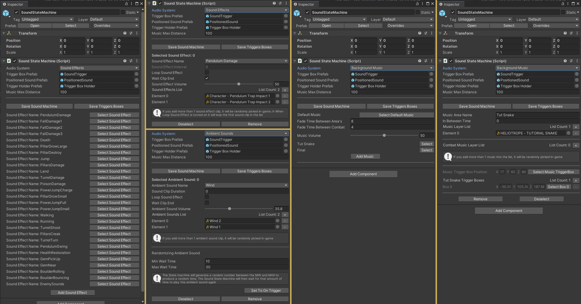 During another PSQ game project i got the task of making a tool for music and sound effects. I instantly got ideas of how to implement a system that both the designers and programmers would enjoy to work with and not bother with any settings of the Unity audio system. With the use of a custom GUI in Unity and lots of time i managed to create a good system that the designers can easily add music, sound effects and ambient sounds. Than the programmer can implement sound effects easily with 2 Methods based on if they want it 3D positioned or 2D static. The music and ambient sound are both handle by themself internaly with several option the designer can choose from, from randomized clips to looping clips or even cutting them at a certain second. In my opinion and from my fellow Desiners and Programmers this tool was a succes.